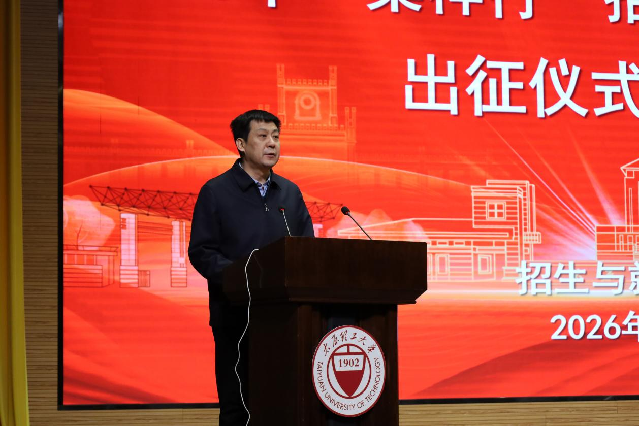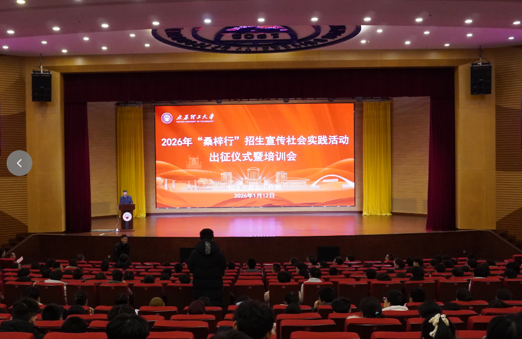 1月12日下午,太原理工大学2026年“桑梓行”寒假招生宣传活动出征仪式在明向校区学生活动中心一层报告厅举行。校党委常委、副校长王志华,招生与就业工作部、校团委、求实(宗复)学院、软件学院相关负责人及志愿者代表参加了出征仪式,仪式由招生与就业工作部部长李栩主持。